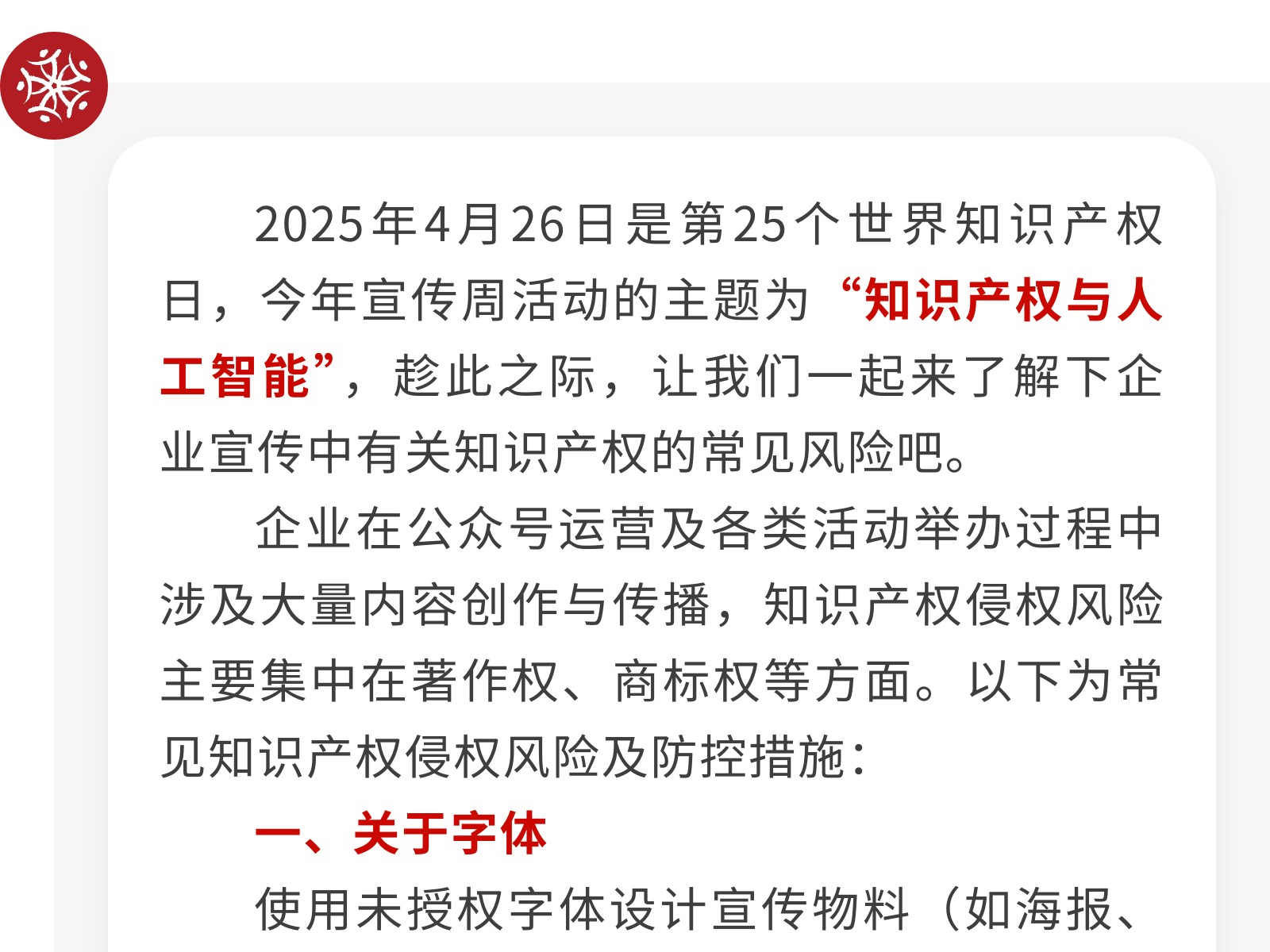 【全國知識(shí)產(chǎn)權(quán)宣傳周】提高知識(shí)產(chǎn)權(quán)意識(shí),守住企業(yè)合規(guī)底線 發(fā)布時(shí)間:2025年04月28日 16時(shí)來源:本站原創(chuàng)瀏覽:172 人次