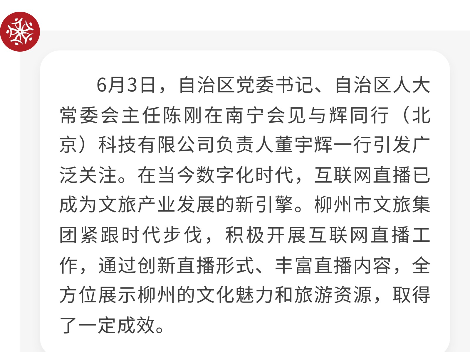 柳州市文旅集團積極探索互聯(lián)網(wǎng)直播矩陣,助力城市文旅新發(fā)展 發(fā)布時間:2025年06月12日 20時來源:本站原創(chuàng)瀏覽:110 人次